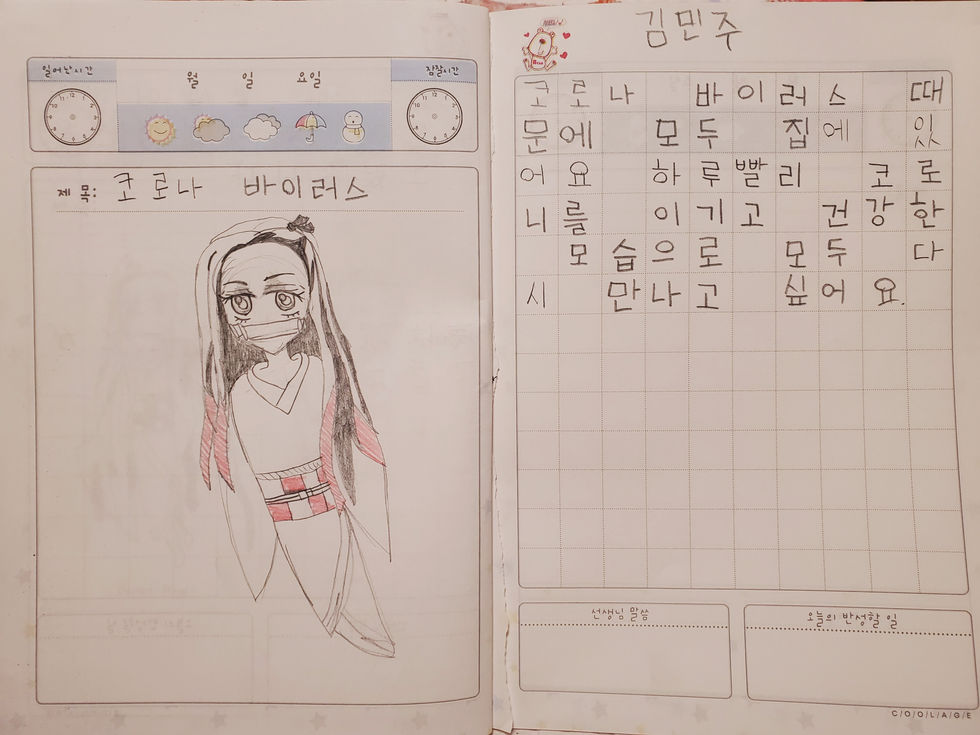 우리 반의 예쁘고 사랑스러운 친구들 도연, 서연, 이나, 지홍, 하원, 민주 그리고 개구쟁이 친구들 명후, 민국, 연우, 예성, 재우, 재웅, 지훈, 태현, 태훈이 모두 선생님에게는 특별하고 소중한 아이들입니다. 만나서 행복하고 친구들에게 한국어와 한국의 역사와 문화를 조금이나마 가르치게 되어 기쁘고, 감사합니다. 우리 어린이들에게 어렵고 슬픈 현실을 맞이하게 되어 너무 속상하고 안타까워요. 하지만 우리 친구들은 어려운 상황속에서도 언제나 웃음을 잃지 않고, 건강한 생각을 가지고 건강한 삶을 살아가도록 기도하고 응원할게요.